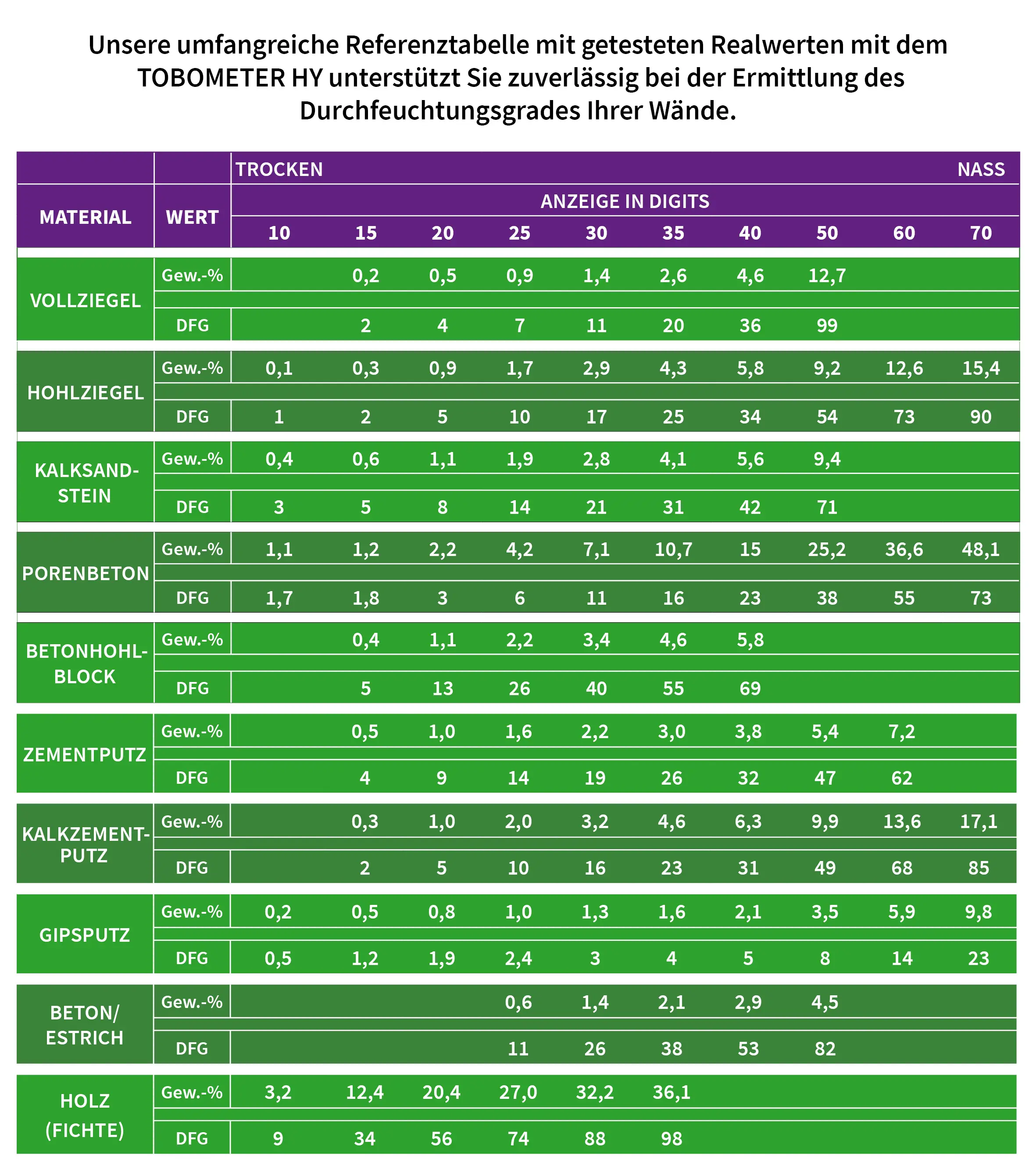 Das Messgerät eignet sich zur Untersuchung von allen gängigen Baustoffen. Zur Ermittlung von Feuchtigkeitswerten können unsere Referenztabelle oder Vergleichsmessungen verwendet werden.