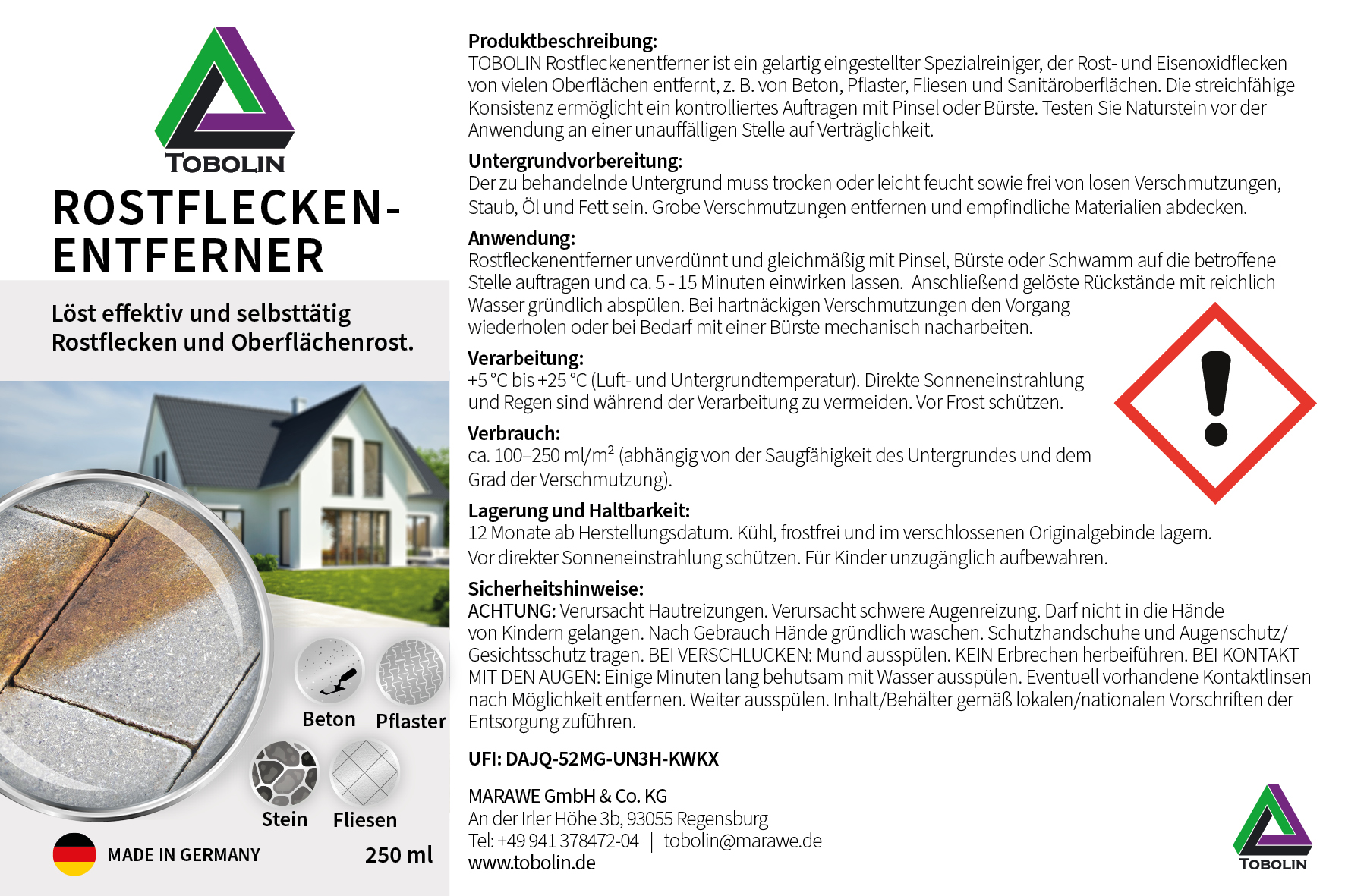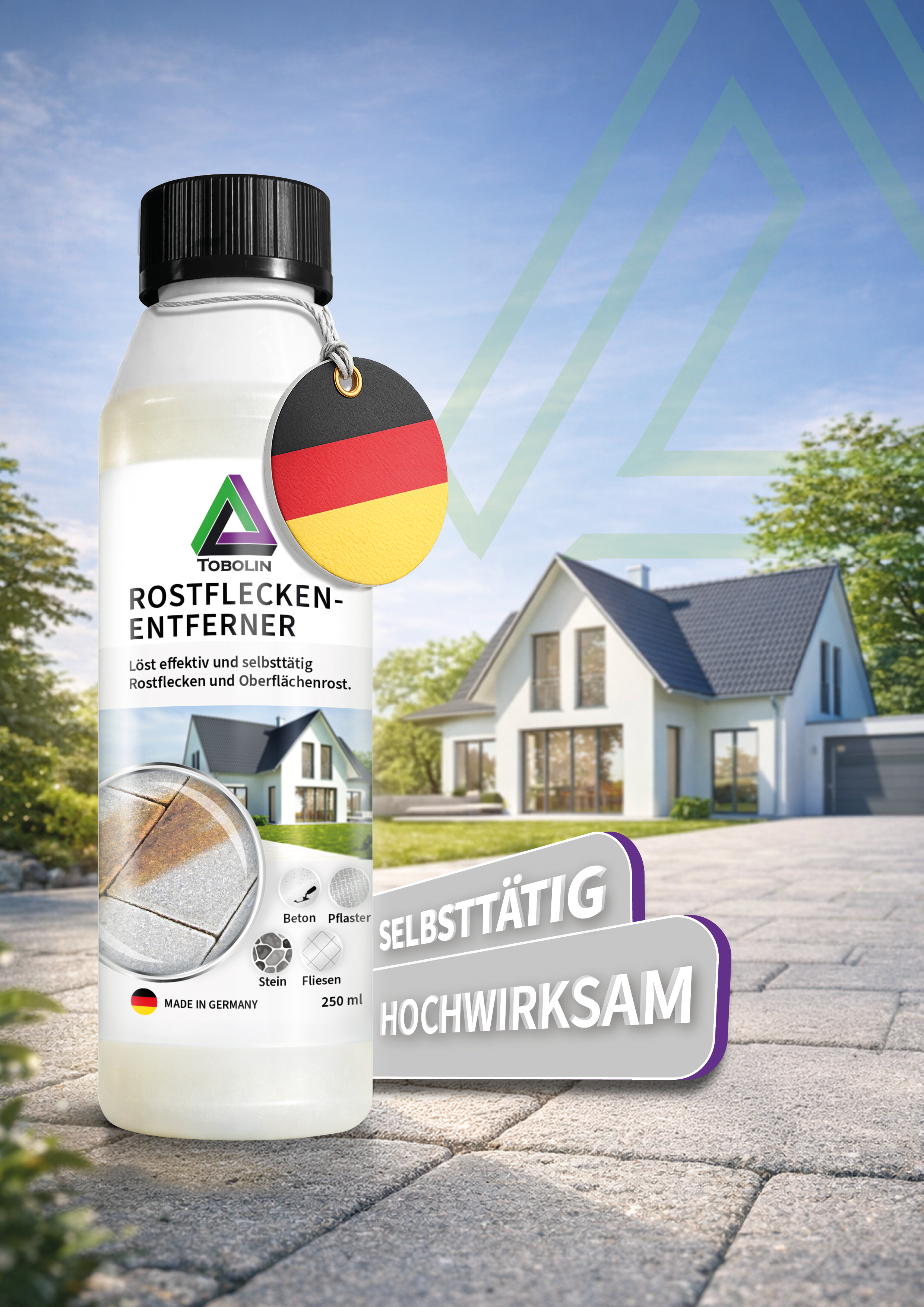 - AKTIVFORMEL GEGEN ROSTFLECKEN: Unser TOBOLIN Rostfleckenentferner löst Rostverfärbungen und eisenhaltige Rückstände dort, wo milde Reiniger oft an ihre Grenzen kommen – ideal für punktuelle Flecken auf Außenbelägen rund um Pflaster & Fugen.
