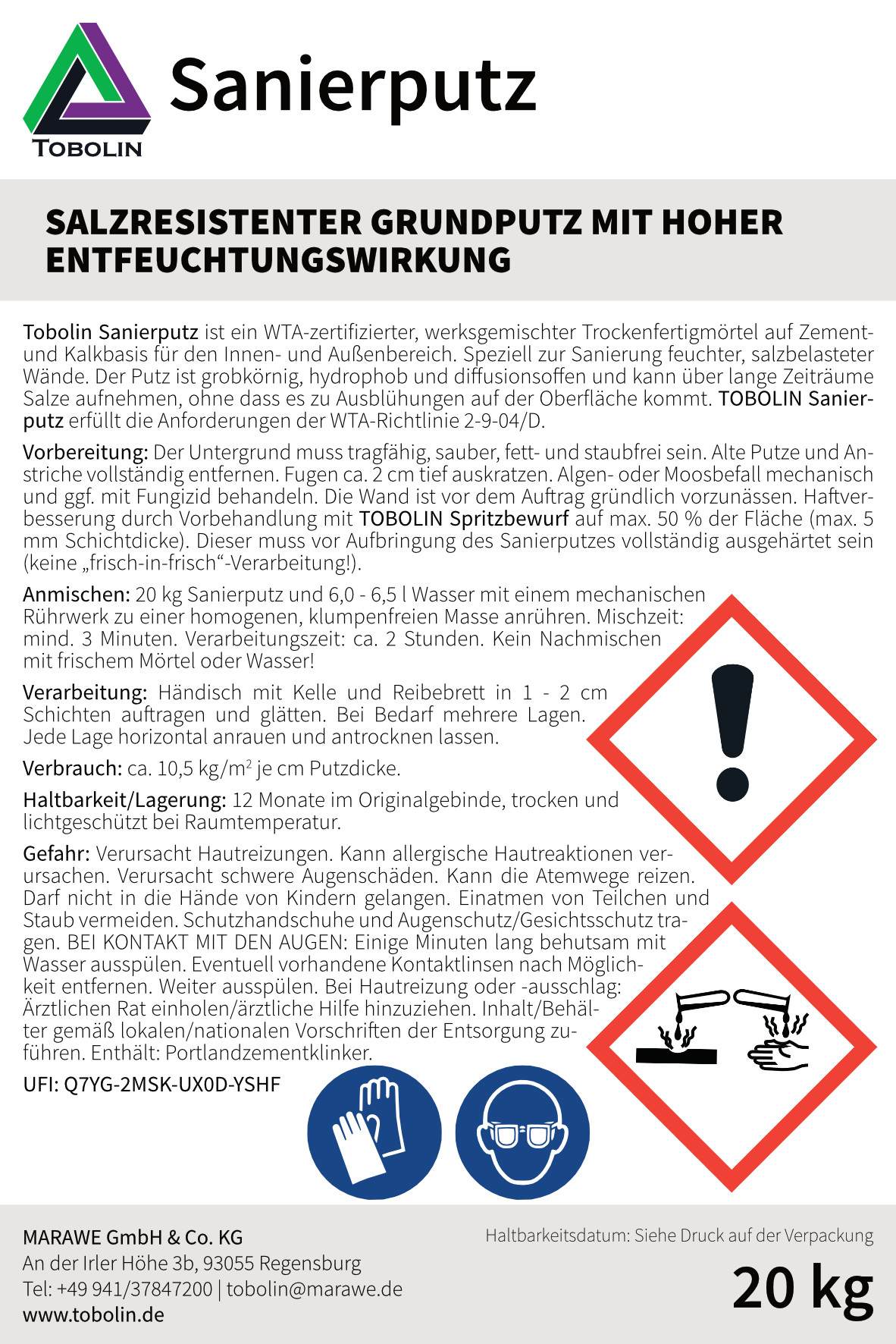 - GEPRÜFTE QUALITÄT: Durch WTA-Zertifizierung nach Richtlinie 2-9-04/D bietet unser TOBOLIN Sanierputz langanhaltenden und zuverlässigen Schutz bei Ihren Sanierungsmaßnahmen.