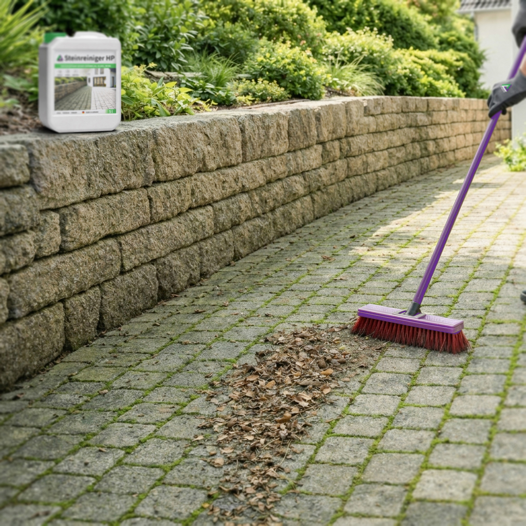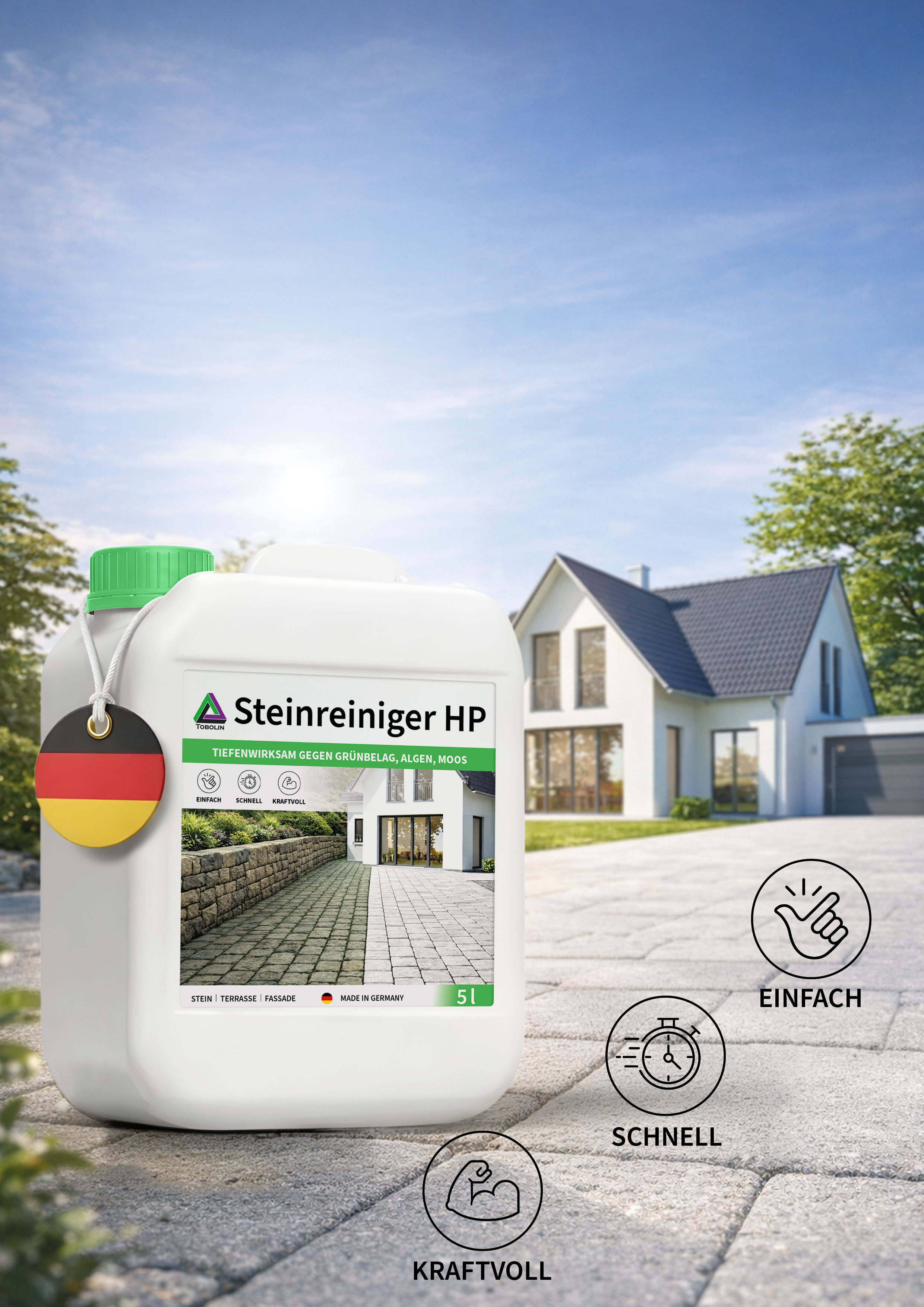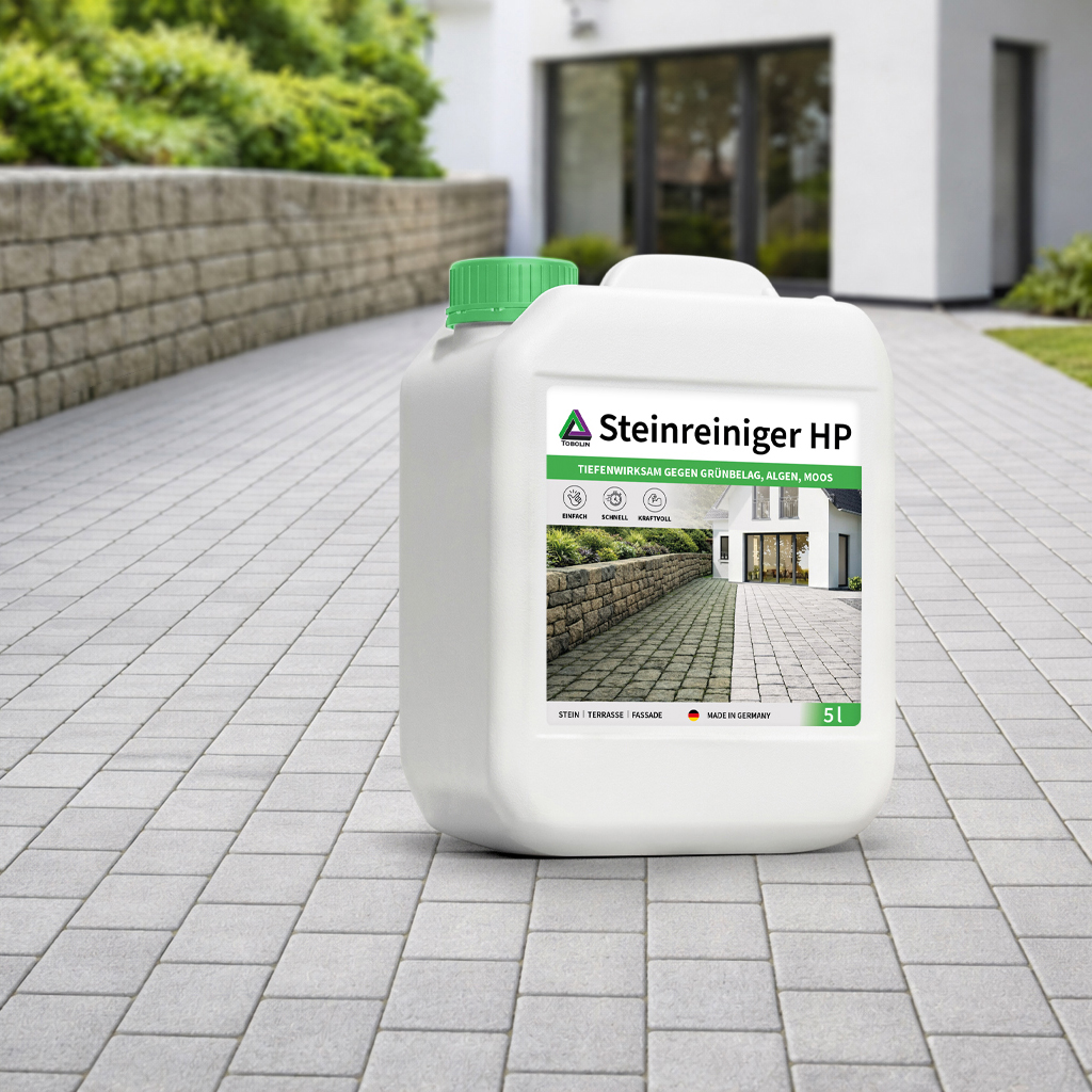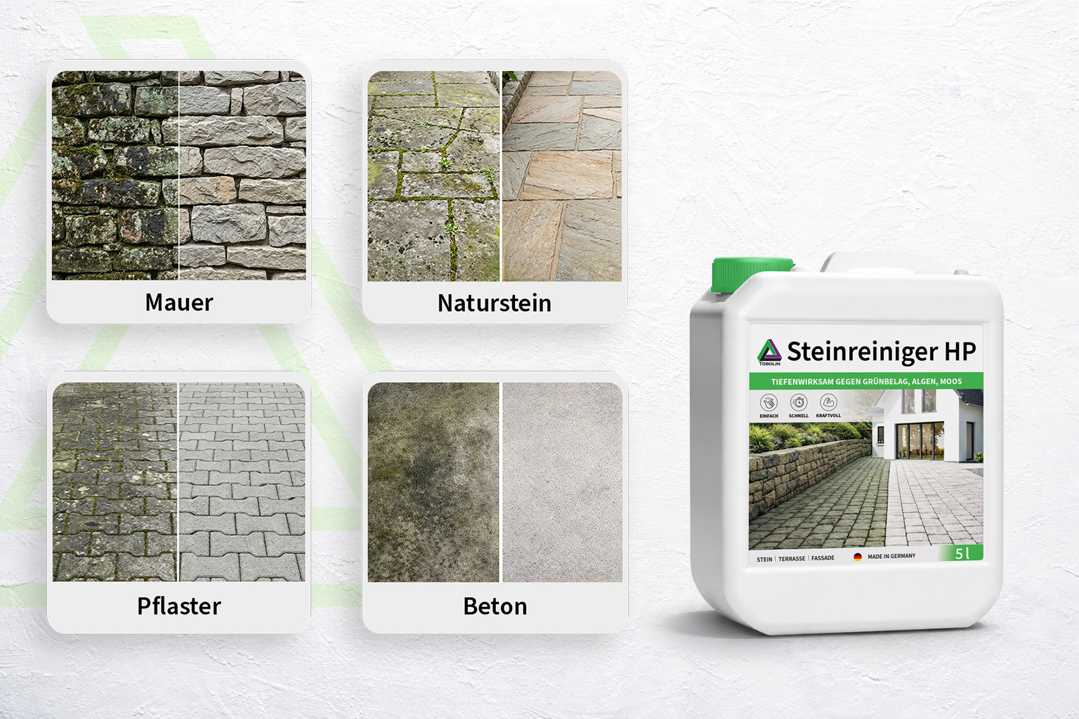 - VIELSEITIG: Steinreiniger HP ist für viele Oberflächen im Außenbereich geeignet – Terrassen, Pflastersteine, Gehwege, Einfahrten und Stufen. Auch nützlich für Naturstein, Beton, Waschbeton, Klinker und Steinplatten. Entfernt Grünbelag, Algen, Flechten sowie Schmutz & Stockflecken – der Intensivreiniger ist trotz maximaler Leistungsstärke schonend für die Steinflächen.