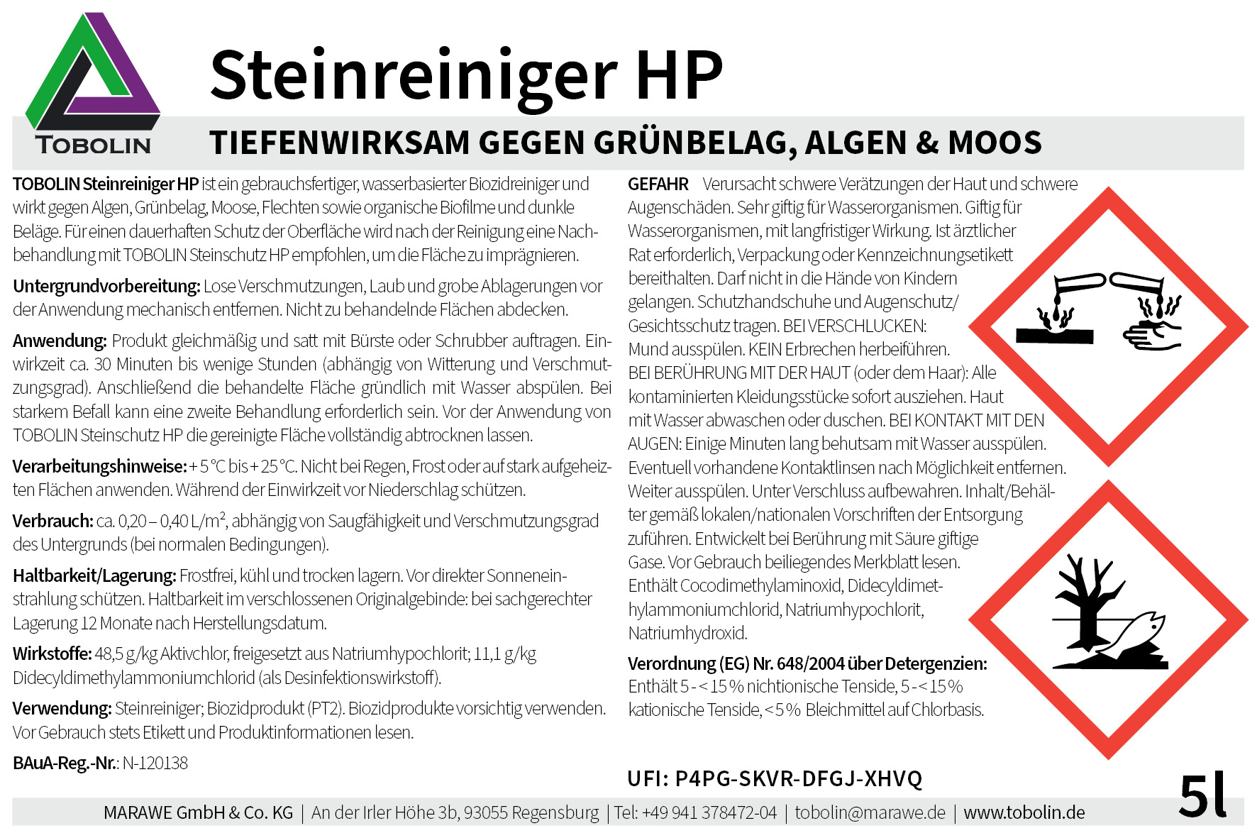 Hinweis: TOBOLIN Steinreiniger HP ist ein Biozidprodukt. Biozidprodukte vorsichtig verwenden. Vor Gebrauch stets Etikett und Produktinformationen lesen. / Reg.-Nr.: N-120138